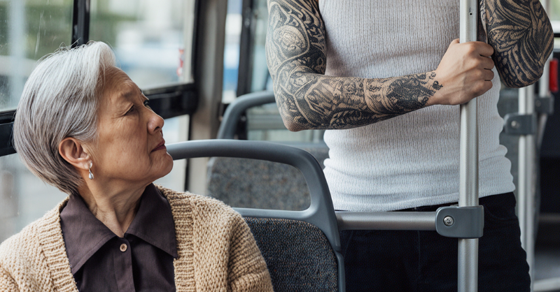 On the bus, an older woman was scolding a young man about his tattoos, and the young man wasn’t paying attention… until this happened…