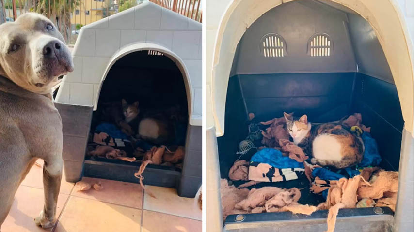 This Sweet Pit Bull Invited Pregnant Stray Cat Into His House To Give Birth
